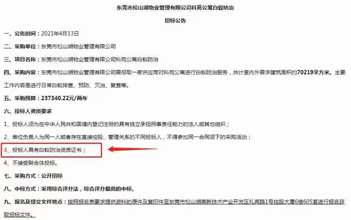 物業管理公司公寓白蚊防治招標要求有白蟻防治資質