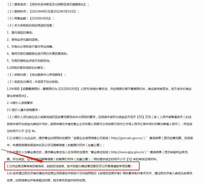 預(yù)算金額:25.2萬元 采購標(biāo)用途:1、室內(nèi)地毯清洗;2、各物業(yè)點(diǎn)化糞池運(yùn)轉(zhuǎn);3、對各辦公場所進(jìn)行室內(nèi)消毒;4、每月對各機(jī)樓服務(wù)處進(jìn)行兩次外圍四害消殺;5、對各機(jī)樓物業(yè)點(diǎn)進(jìn)行白蟻防治。 招標(biāo)資質(zhì)要求:供應(yīng)商須具備四害消殺、白蟻防治資質(zhì)、技術(shù)和能力等經(jīng)營范圍及可開具增值稅專用發(fā)票。